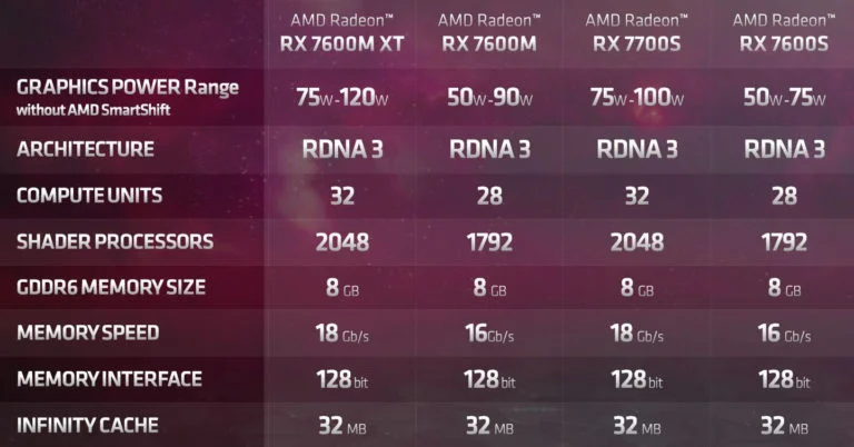 A AMD anunciou a série Radeon 7000 para notebooks há quatro meses, mas somente agora as fabricantes começaram a enviar os notebooks com a placa de vídeo. O modelo RX 7600S é uma placa de vídeo discreta de nível de entrada, com a GPU Navi 33 integrada e 8GB de VRAM. Porém, essa variante é a mais lenta da série RDNA3, competindo com as placas NVIDIA Max-Q. A GPU conta com 28 unidades de processamento (1792 processadores shader) e opera dentro de um limite de TDP entre 50W e 75W.