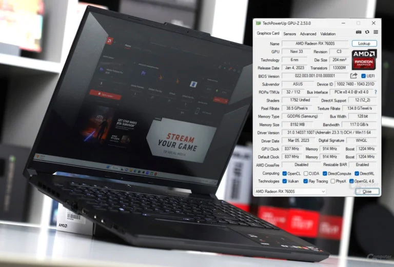 A GPU foi testada pelo site alemão ComputerBase em um laptop ASUS TUF Gaming A16 equipado com um AMD Ryzen 7 7735H (Rembrandt-R Zen3 APU) e 8GB de memória DDR5-4800. O review se concentrou em comparar a Radeon RX 7600S com a GeForce RTX 4060 Laptop GPU. Em testes com o 3DMark TimeSpy, ambas as GPUs oferecem desempenho semelhante em um TDP de 70W, mas a diferença aumenta a favor da RTX 4060 acima deste nível de potência.