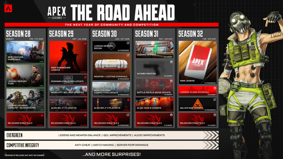 Mergulhe no que está por vir para o Apex Legends em 2026! Com as comemorações de aniversário chegando com toda a força e uma nova temporada lançada com Fissura, a equipe de desenvolvimento está compartilhando uma visão do que chegará ao título este ano, incluindo novas Lendas, grandes atualizações de mapa, evoluções competitivas, eventos Coringa e um foco contínuo na integridade competitiva.