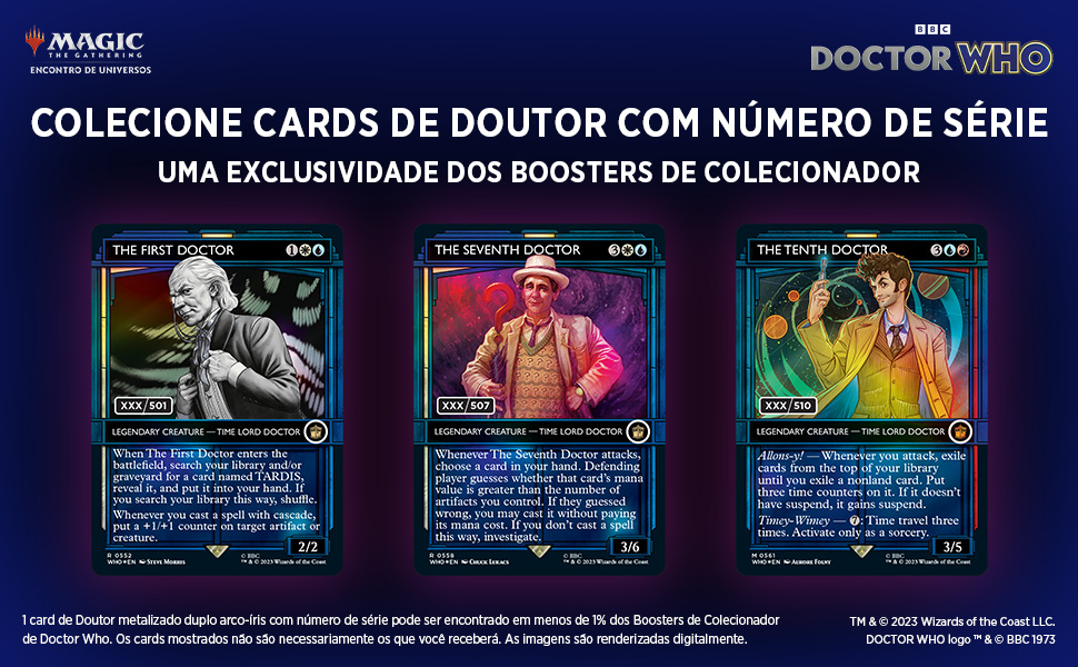 Para os colecionadores, a expansão oferece versões especiais da TARDIS, disponíveis apenas nos Boosters de Colecionador, com artes exclusivas. Além disso, cards raros e serializados dos Doutores, limitados a cerca de 500 impressões, podem ser encontrados nos mesmos boosters.