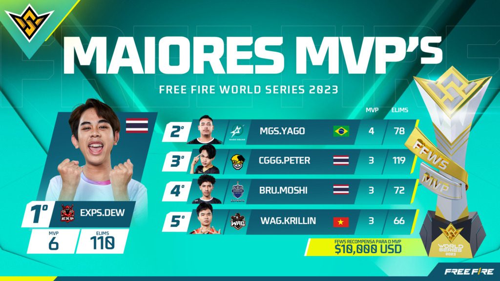 Dew da EXP Esports foi nomeado o MVP do Mundial FF, com um total de 6 indicações de Melhor Jogador e 110 eliminações ao longo da temporada. Seu talento como sniper se destacou, solidificando seu nome no hall da fama do Mundial FF.