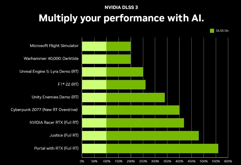 A RTX 4070 é capaz de executar jogos mais recentes em mais de 100 quadros por segundo em 1440p, graças ao DLSS 3. A placa também é mais rápida do que a RTX 2070 SUPER, sendo em média 2,6x mais rápida usando o DLSS 3 e, em média, 1,4x mais rápida com o DLSS 3 ativado do que a GeForce RTX 3080. Isso é possível graças ao aumento de desempenho proporcionado pelo DLSS 3.