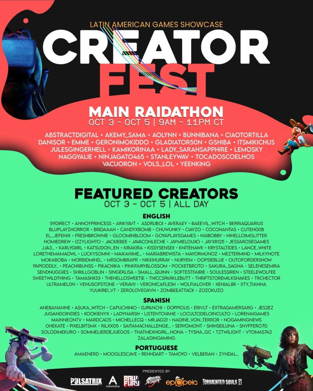 De 3 a 5 de outubro, o Latin American Games Showcase (LAGS) realiza sua primeira edição do Creator Fest, evento online dedicado a apoiar jogos latino-americanos. Em parceria com a Twitch Latin Guild, o festival terá o Main Raidathon, com criadores selecionados transmitindo jogos em raids organizados. Além disso, mais de 130 criadores apresentarão diferentes games em seus canais, garantindo diversidade e conteúdo para todos.