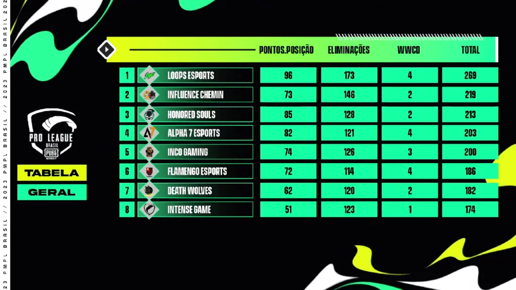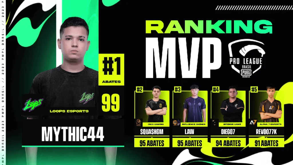 Dos 20 times, apenas 16 se classificaram para os League Days, que se encerram nesta semana. Com 269 pontos, a Loops Esports segue na liderança da competição e tem Matheus “Mythic” Arantes como MVP, com 99 abates até agora. Influence Chemin, Honored Souls, Alpha 7, iNCO Gaming e Flamengo eSports também estão na disputa pelas vagas para a PMPL Américas.