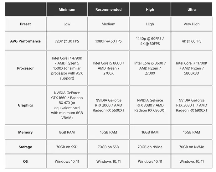 Além dos requisitos tivemos também o detalhamento de cada uma das features disponibilizadas para os jogadores, podemos evidenciar o DLSS e a compatibilidade completa com o Dualsense.