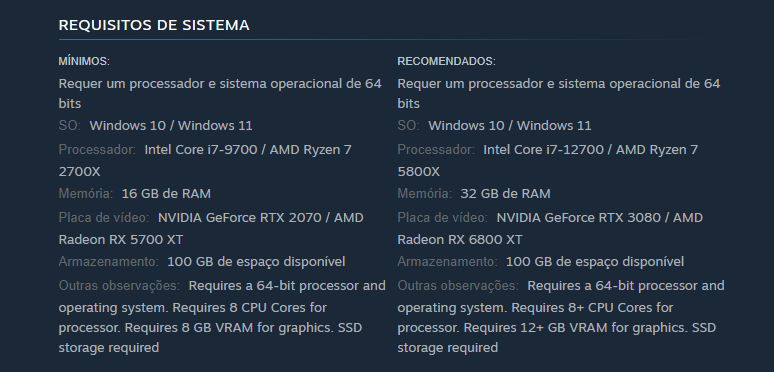 Para visualização completa do que cada versão carrega consigo, clique aqui. Agora você aí jogador de PC está curioso pelos requisitos mínimos e recomendados, segue abaixo: